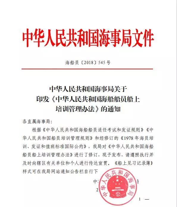 各直屬海事局: 根據(jù)《中華人民共和國海船船員適任考試和發(fā)證規(guī)則》《中華人民共和國船員培訓(xùn)管理規(guī)則》和經(jīng)修訂的《1978 年海員培訓(xùn)、發(fā)證和值班標準國際公約》,我局對《中華人民共和國海船船員船上培訓(xùn)管理辦法》進行了修訂,現(xiàn)予發(fā)布,請遵照執(zhí)行并及時向轄區(qū)有關(guān)單位和個人進行傳達宣貫?!洞弦娏?xí)記錄簿》樣式可在我局網(wǎng)站通知公告欄自行下載。