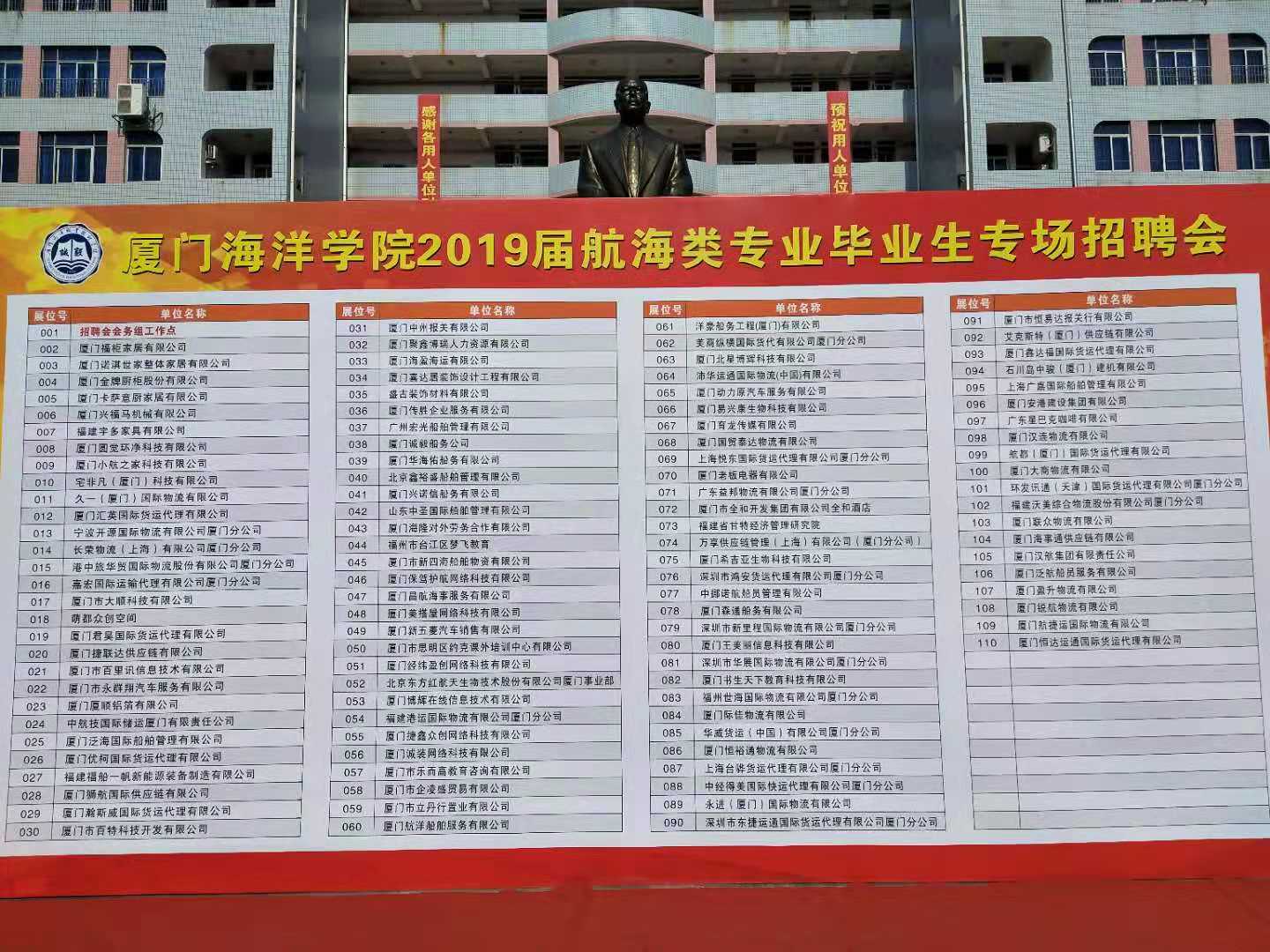 2018年11月21日 廈門(mén)海盈海運(yùn)有限公司行政人事部代表公司前往廈門(mén)海洋學(xué)院參加2019屆航海類(lèi)專(zhuān)業(yè)畢業(yè)生專(zhuān)場(chǎng)招聘會(huì)。